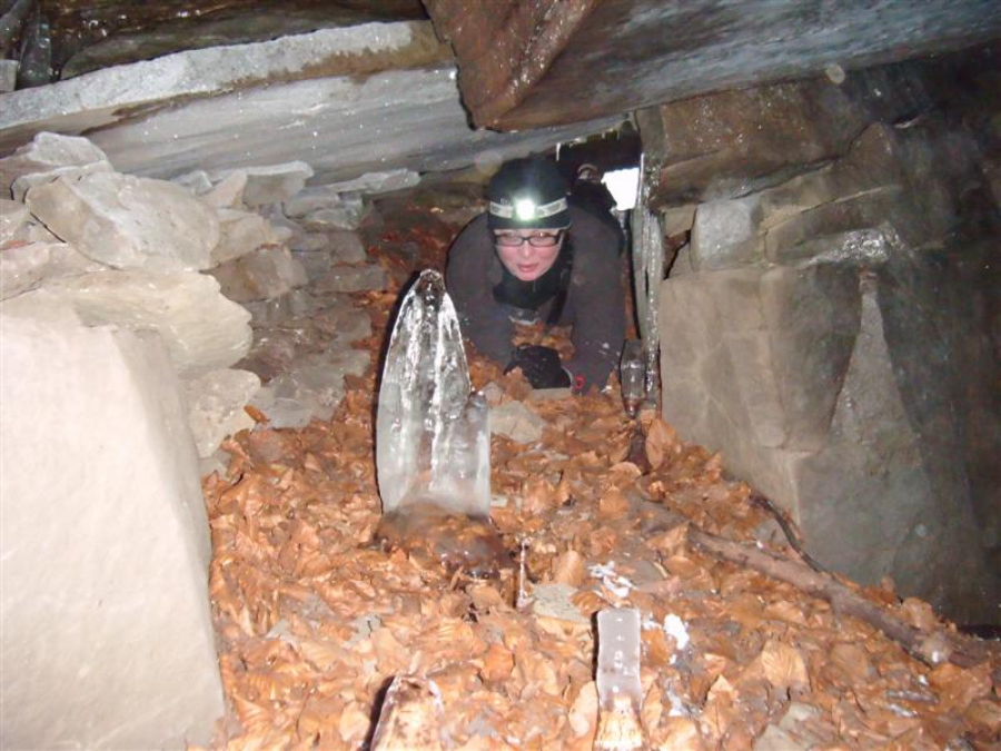 Na zdjęciu - Agnieszka. Po lewej stronie widoczny murek kamienny, który został zbudowany przez członków SBB - ma to na celu wzmocnienie płyty nad odcinkiem wejściowym. Było kilka nacieków lodowych. To był wyjazd narciarski.