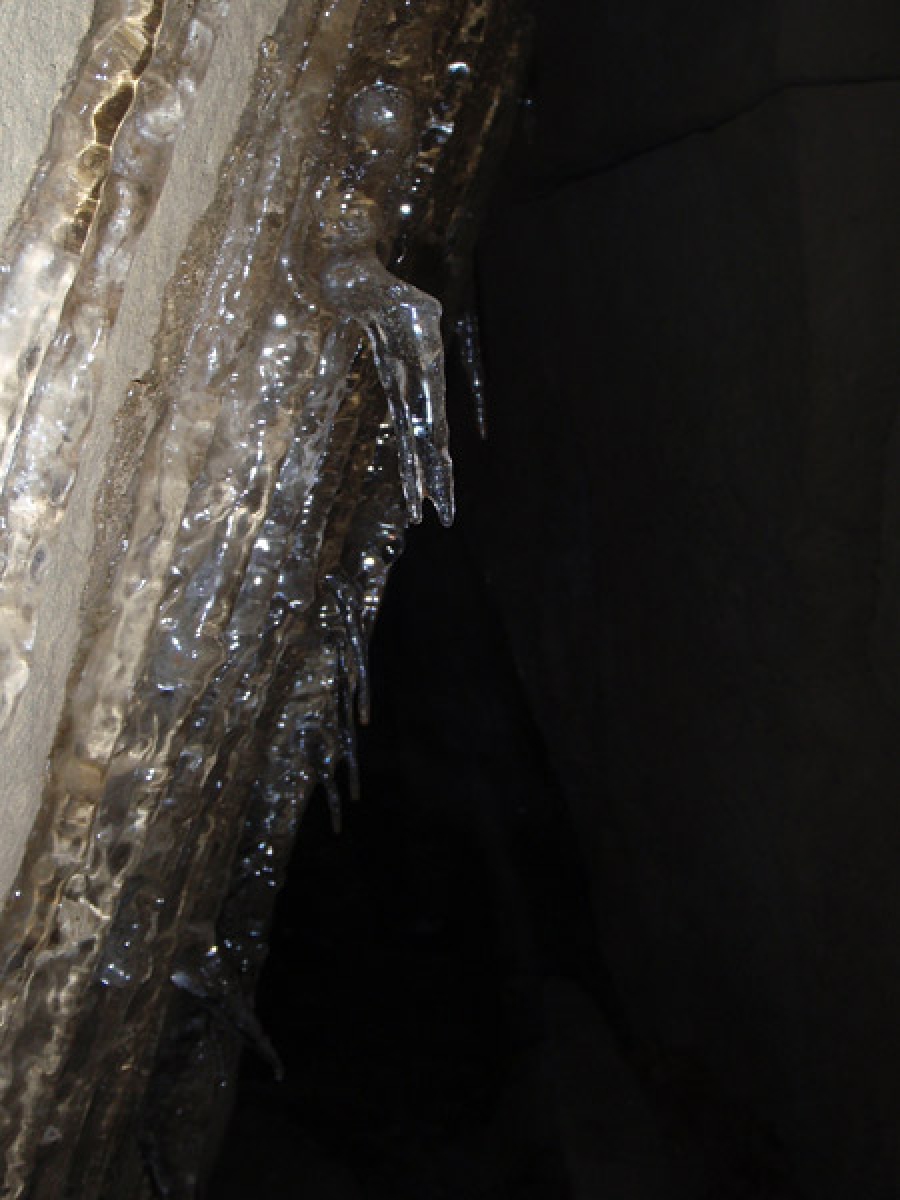 Popołudniowa piesza wycieczka na Muronkę. Z powodu znacznej ilości śniegu nie odnaleźliśmy Jaskini Chłodnej, jednak warto było się tam wybrać choćby po to, aby podziwiać odziane w zimową szatę rumowisko. Wstąpiliśmy do Jaskini pod Balkonem K.Bs-02.16, którą zdobią gustowne lodowe heliktyty (na zdjęciu).