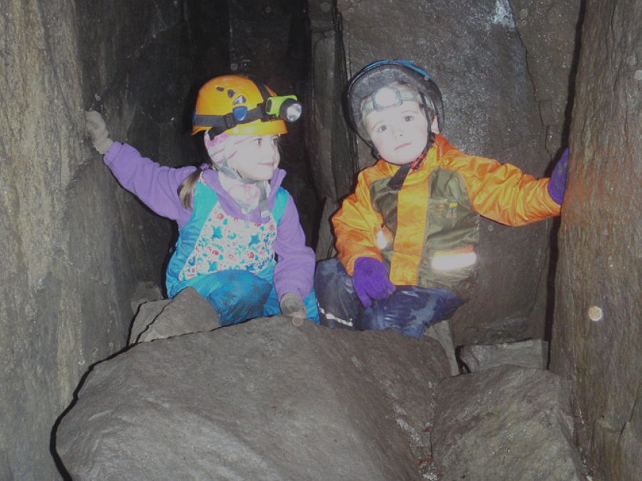 Akcja weszła w decydującą fazę: odpowiednio wyposażeni zniknęliśmy w Wietrznej Dziurze. Nie brakowało tam atrakcji takich jak mała wspinaczka, miniaturowy trawersik czy eksploracja intrygujących zakamarków. Na zdjęciu: trzon zespołu szturmowego, czyli Oliwia i Mikołaj.