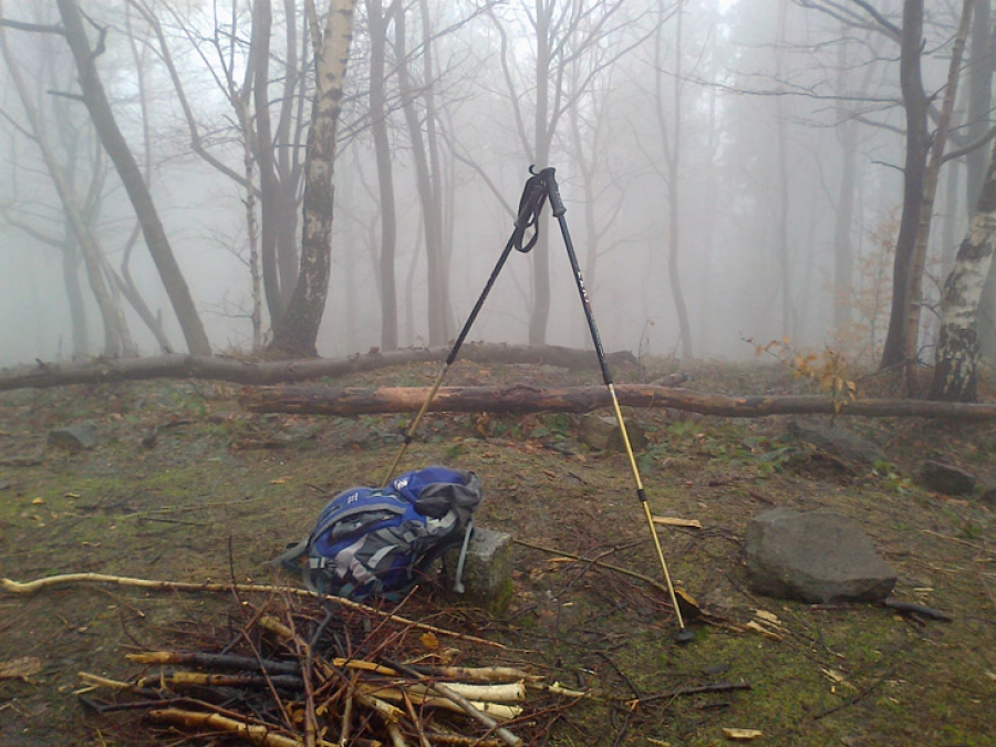 Krajobrazy mało zimowe, choć nie pozbawione pewnego uroku. Szczyt (na zdjęciu) tonął w siąpiącej chmurze. Gdy zbliżałem się z powrotem do auta, mżawka zamieniła się w delikatną śnieżną kaszę.