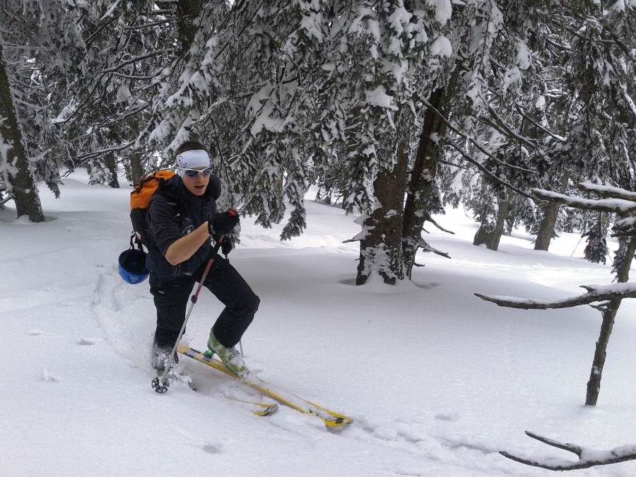 Podejście z Sopotni Wielkiej, najpierw dolinką, potem na wprost. Ze szczytu zjechaliśmy przez las do czerwonej trasy i odwiedziliśmy jaskinię Przy Rozdrożu. Zjazd do z Miziowej do Sopotni równie przyjemny jak ten ze szczytu, śniegu dużo i zjeżdża się bardzo płynnie. Nie spotkaliśmy narciarzy, bo wyciągi były zamknięte - cała góra nasza.