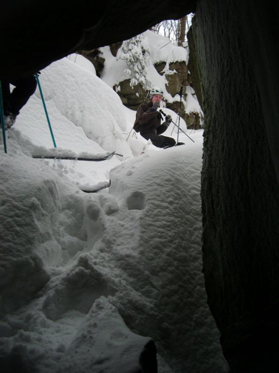 Dużo śniegu. Podchodziliśmy z Ostrego. Spotkaliśmy kilka skuterów śnieżnych. Trzy "zdetreminowane osoby" dotarły do jaskini /zdjęcie/. W schronisku spotkaliśmy Borysa Witańskiego - Sekcja Młodzieżowa, oraz Martynę Michalską - Osoba Towarzysząca z koleżanką. Główna grupa zjechała "na wprost" do Ostrego uruchamiając nawet jedną małą lawinę!.