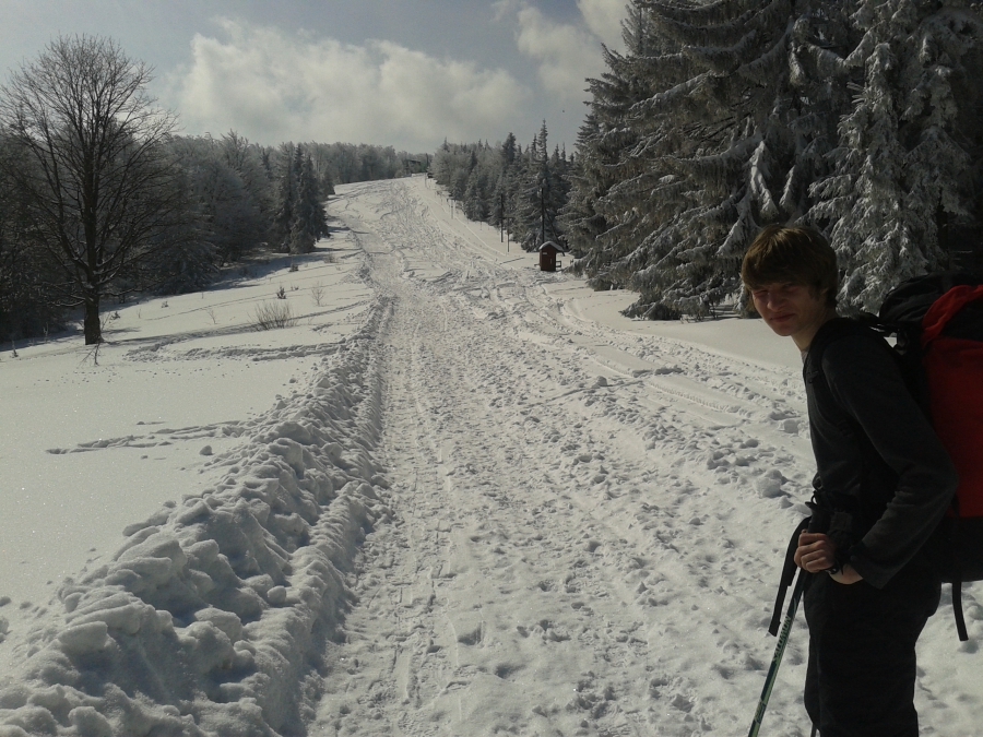 Wystartowaliśmy z przystanku 8 na Klimczok, dalej na Stołów skąd zjechaliśmy do Wapiennicy przez las, następnie wyszliśmy nie znaną nam drogą do górnej stacji kolejki i zjechaliśmy na Dębowiec. Pogoda piękna, śniegu dużo.