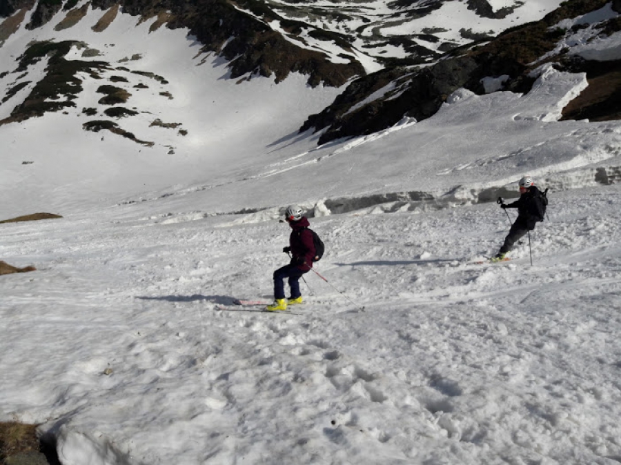 Suma przewyższeń ponad 1000 m. Zjechano ze szczytu. Warunki narciarskie dobre, na dole krótkie odcinki do przejścia na butach. Cały czas Słońce. W górach mało narciarzy, jeden w krótkich spodniach. Wszyscy zadowoleni.
