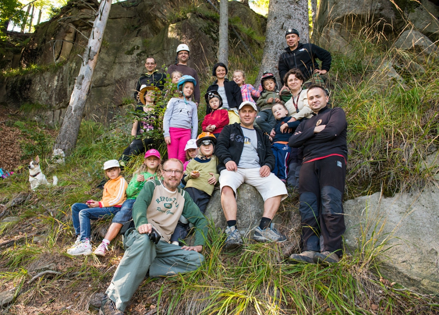 Pod szczytem Muronki odbiliśmy w kierunku południowym. Na skraju rezerwatu "Kuźnie" nastąpiła krótka przerwa na posiłek i założenie bardziej "technicznych" ciuchów, po czym dziarsko wkroczyliśmy w jeden z najdzikszych zakątków Beskidu Śląskiego... W tajemniczą krainę potężnych, omszałych, groźnie spękanych piaskowcowych głazów, ambon i murów. Działaliśmy w eksponowanym terenie, szukając przejścia przez strome, najeżone skałami zbocze. Mimo to szybko zlokalizowaliśmy główny otwór Jaskini pod Balkonem K.Bs-02.16. Młodzież uzbroiła się w kaski, czołówki, a nawet ochraniacze. Rozpoczęła się główna, jaskiniowa część akcji! Zarówno mali, jak i duzi z zapałem zwiedzali ten niebanalny obiekt - oczywiście (ze względu na liczebność zespołu) turami. Wewnątrz, na ścianach drzemały ładnie ubarwione ćmy. Obok dziury zrobiliśmy sobie portret grupowy pozowany (autorem zamieszczonego wyżej zdjęcia jest Roman).