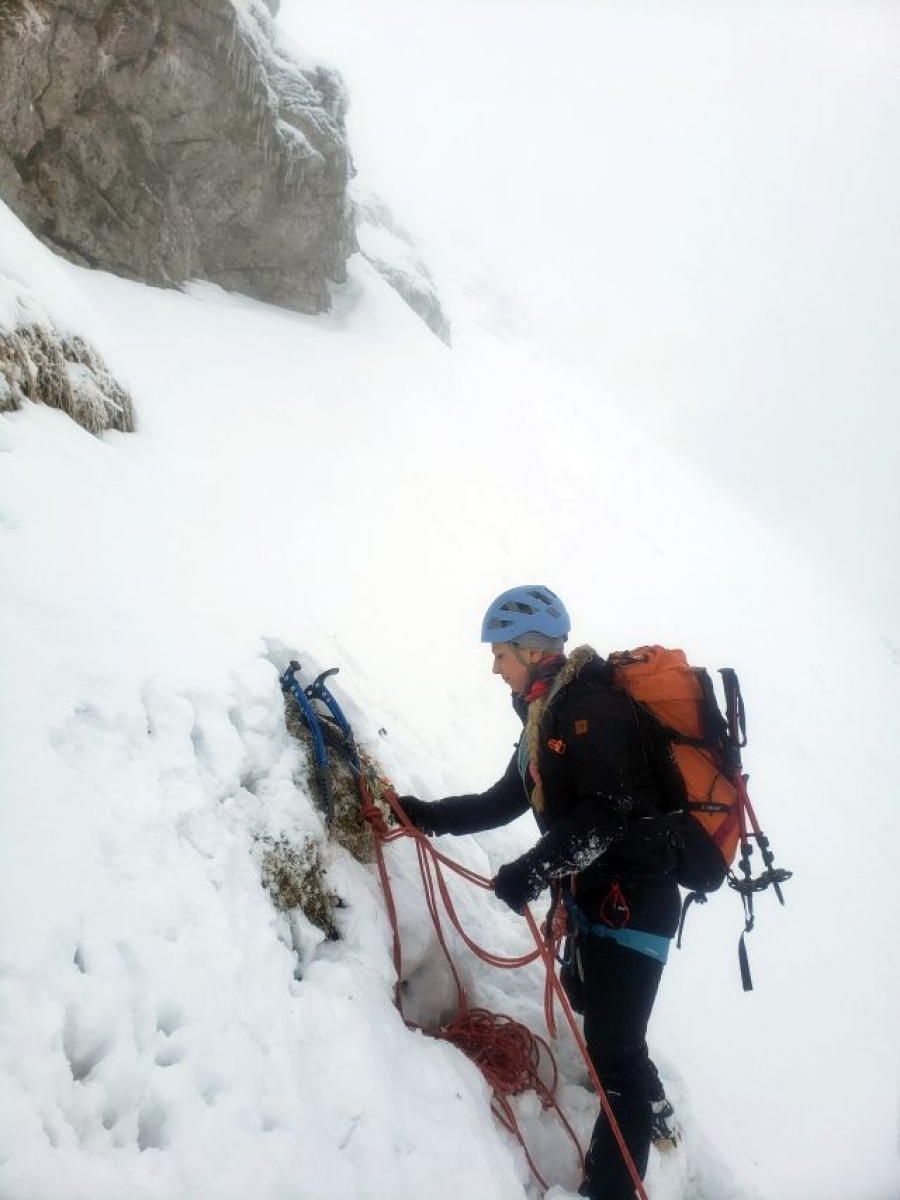 Planowaliśmy zrobić solidne przejście graniowe z topografią i uzupełnieniem szkolenia zimowego. Pokonał nas jednak rozmokły, głęboki śnieg, czas i kiepska w sumie pogoda. Niemniej podeszliśmy pod Jaskinię Śnieżną, sprawdziliśmy godne podziwu "dzieło budowlane", były liczne pogadanki, badanie profilu śniegowego, ustawianie azymutu z mapą, a nawet wspinaczka z zakładaniem stanowisk z igieł do traw. Na bazie dzielnie uzupełnialiśmy teorię, było kilka wykładów i pogadanek. Wklejam zdjęcie tylko jednej osoby, mgła nie pozwoliła mi objąć w kadrze Was wszystkich, niemniej zdjęcie obrazuje nasze przygody.