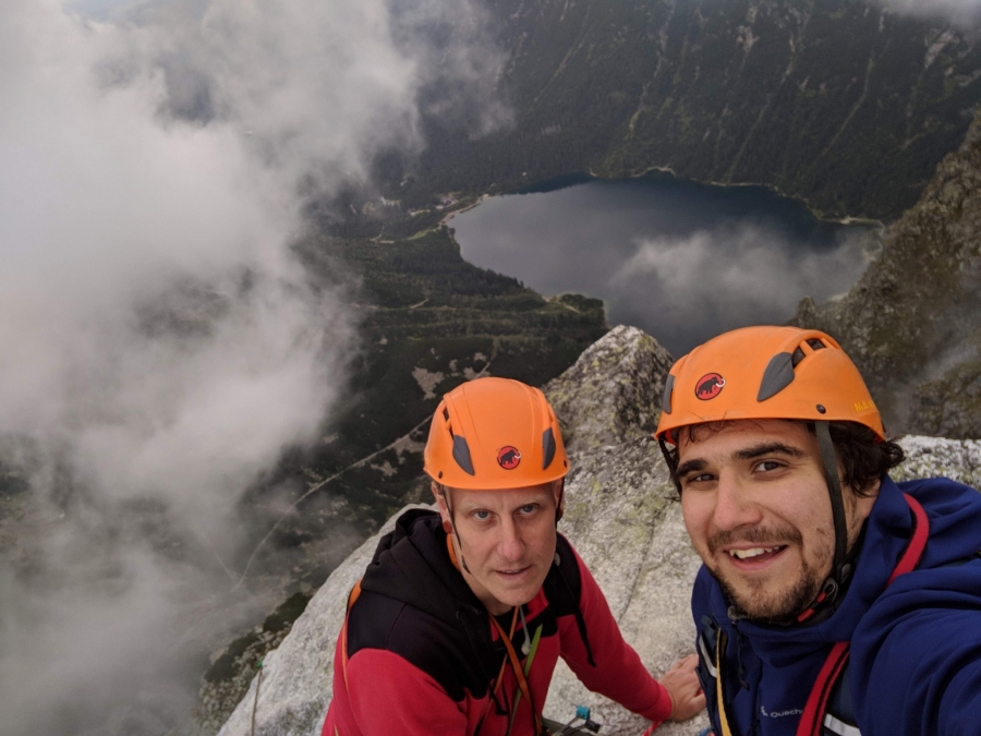 Wyjechaliśmy z Tychów o 3:20 by w miarę wcześniej wejść do Parku, bo podejście trochę czasu nam zajmie. Tempo było dobre, ponieważ o 9:40 jesteśmy już pod ścianą. Szybkie przebranie się, podział sprzętu, topo i o 10:00 zaczynamy wspinanie Drogą Klasyczną. Wyciągi prowadzimy naprzemiennie, pierwszy wyciąg zaczyna Maciej. Na ścianie wszystko idzie bez problemów. O 14:20 wchodzę na szczyt na którym jestem sam i czekając na Macieja podziwiam niesamowite widoki. Po kilkunastu minutach dociera do mnie Maciej, robimy kilka zdjęć i przygotowujemy sprzęt i liny do wycofu, gdyż niżej słychać kolejne zespoły wchodzące na szczyt. Sprawnie zjeżdżamy na dół i po 16 ruszamy w kierunku Morskiego Oka.
