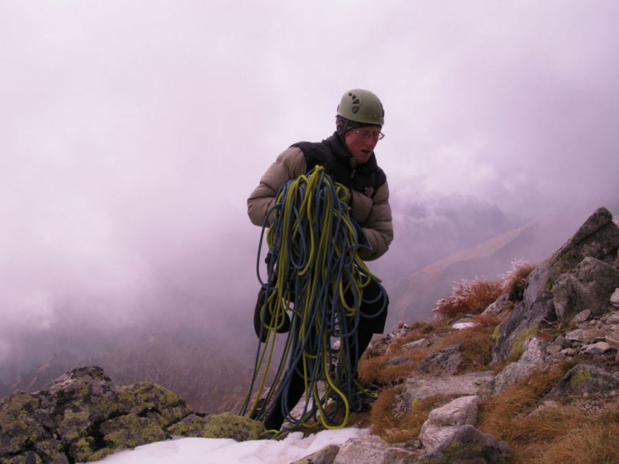 W niedzielę słońca troszkę więcej niż w sobotę, ale i tak stanowczo za mało. Udało się zrobić wylany lodem Komin Komarnickich na Małą Szarpaną Turnię i dalej grań Szarpanych. Grań piękna, płyty oferują fajny wspin, jednak ze wzrostem wysokości pojawia się oblodzenie sprawiające, że na tych najłatwiejszych odcinkach grani schodzi nam najwięcej czasu. A na Szarpanych też kilka zespołów.