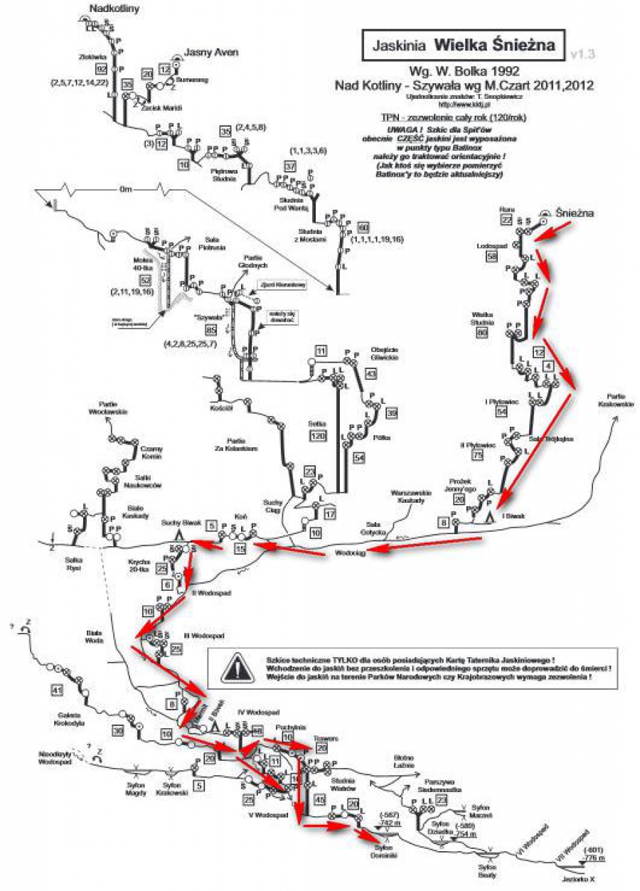 Trochę pobłądziliśmy, zahaczyliśmy przez przypadek o V Wodospad, wycof i już do celu, przez Studnię Wiatrów, do Syfonu Dominiki – 567 m. Ciepłym obiadem nikt nie chciał nas poczęstować, więc pozostało tylko powoli wracać na Suchy Biwak. Po drodze, chyba na IV Wodospadzie, nie uznałam za stosowne skorzystać z liny prowadzącej, więc już wiem jak to jest dostać z wiadra pełnego wody ;)