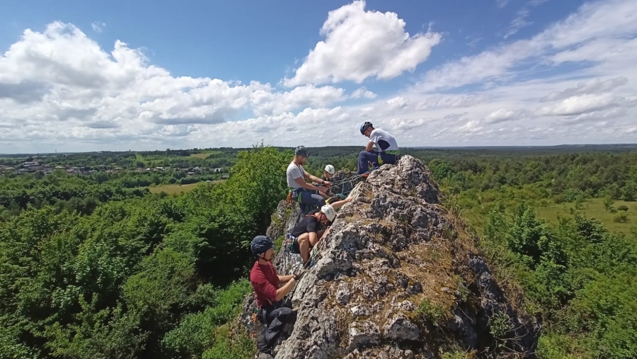 Następnego poranka ćwiczyliśmy na bardziej wymagających skałach w Podlesicach na Górze Zborów tj. Wielbłąd oraz Sówka. Emocji było sporo. Koniec końców wszyscy byli zadowoleni, że mimo pogody udało się zdobyć podstawową wiedzę wspinaczkową.