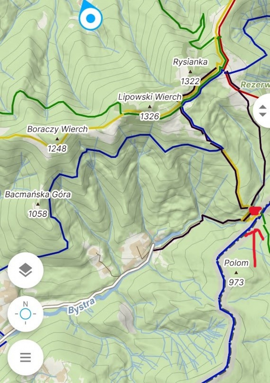 Miałem sprawdzić nowe miejsce na biwak zimowy na Bacmańskiej Górze. Nie doszedłem z powodu uszkodzonej nawigacji i nadmiaru śniegu! Akcja zostanie niebawem powtórzona. Dotarłem jedynie do Schroniska na Rysiance - zjazd do Złatnej. Na mapce jest zaznaczone miejsce w którym rośnie bardzo wysokie drzewo - osoby zainteresowane mogą to sprawdzić /minimum 40 m/. Suma przewyższeń - 567 m.