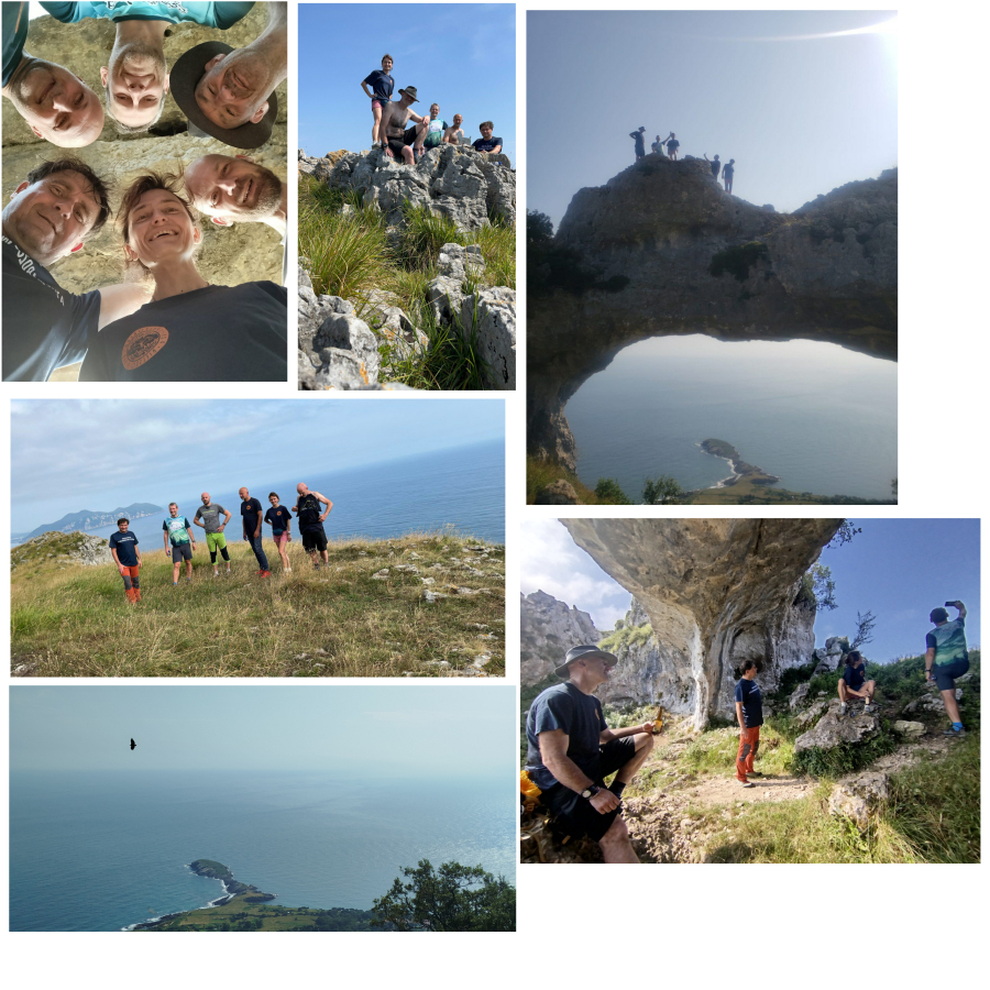 Po wylądowaniu w Bilbao, odebraniu z wypożyczalni aut, udajemy się na przejściowe miejsce biwakowania, wybrane spontanicznie na mapie. Jest to parking nad zatoką. Zakaz biwakowania, palenia ognisk, kamperów i wiele więcej. Na parkingu kilkanaście samochodów z zostającymi na nocleg serferami. Nocujemy. Noc lekko deszczowa, ciepła, nad oceanem, minęła spokojnie i szybko. Rano po kawie pada pomysł, że skoro wkoło są piękne, wapienne, skaliste góry z widocznymi z dołu dwoma wielkimi otworami, oknami skalnymi, pozostałościami jaskiń, to idziemy na wycieczkę zwiedzić Diabelskie Oczy i rozruszać się po dniu podróży. Wyspinaliśmy się krętą górską ścieżką kluczącą między kolczastymi krzewami i skałami na grzędę skalną okalającą zapadlisko krasowe, na wysokość około 400 metrów nad poziom morza. Tutaj po skałach dotarliśmy do okien. Po niebie ponad nami krąży kilkadziesiąt sępów. Czują trupa. Taki stereotyp. Turystów w rejonie było wielu. Docieramy do Oczu Diabła. Sesje fotograficzne, do pamiętników, na stronę klubową, na fejsbuka, dla znajomych i dalej, idziemy wkoło leja krasowego. Dowiadujemy się z opisów terenu, że funkcjonowała tu kopalnia rud żelaza. Szlak prowadzi częściowo po drodze do wyrobisk, gdzie murki z kamieni umacniają urwiska, żeby z drogi można było korzystać. Leżą tu porozrzucane kawałki rudy. Kolekcjonersko każdy schował do kieszeni po bryłce rudy. Szlak w koło leja oferuje przepiękne widoki na skaliste Góry Kantabryjskie, na bajkowe zatoczki w większej Zatoce Baskijskiej na Atlantyku, położone w dolinkach i na zboczach gór wioski i maisteczka. Upał trochę utrudniał wędrówkę, ale oprawa i wiejąca od morza delikatna bryza wynagradzała cierpienie. Dodatkową atrakcją jest kąpiel w zatoce w okropnie słonej oceanicznej wodzie, która spłukała z nas pot, zmęczenie i była... plażą nudystów. Nikt z nas się nie wyrozbierał ale nikt nas z plaży nie wywalił.