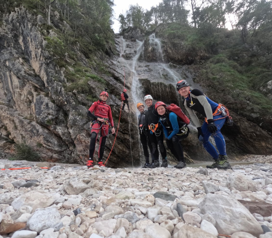 Rio Macile (Rio Brussine) - ja już tu byłam, ale kompletnie go nie pamiętałam, prócz ryzyka porażenia prądem przy ściąganiu ostatniej liny. Kanion super ma wszystko co kaniony powinny mieć: pionowe progi jeden za drugim, skok a nawet tobogan, który tylko Gośka T. pokonała ;) wody wystarczająco, czas przejścia też tak akurat, jednym słowem do powtarzania co roku ;) . Na podejściu spotykamy Pawła F. , który dołącza do naszej ekipy. Rio dell‘Ambruseit - dolna część. Nooooooo ......kanion piękny i z bardzo dużą ilością wody. Zajmuje nam więcej czasu niż w opisie, ale w opisie jest 9 progów a w realu 14!! Ale pięknie rozwinięty w wapiennych warstwach i oświetlony słonkiem bardzo nam się podoba. Przestaje nam się podobać, kiedy musimy wpierw popylać w dół rzeki a potem podejść na górę, na parking.
