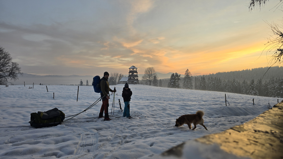 Jako że spadło trochę śniegu postanowiliśmy z synem wybrać się na pierwszy biwak zimowy tej jesieni. Murzyn w piątek przejeżdżając przez Orawę potwierdził iż od biedy można na nartach iść, no to się wybraliśmy. Założenia wypadu były dwa: sprawdzić jak spisują się pulki zrobione z sanek wędkarskich ze sztywnym holem i biwakowanie zimowe z psem.